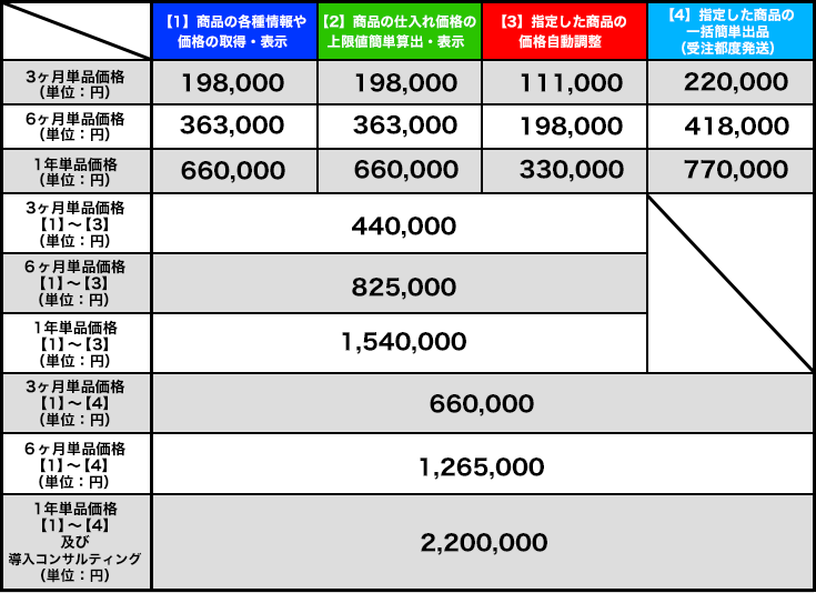 セカリサ(半自動販売システム) 始めるなら知っておきたいポイント! セカリサが選ばれる理由 システムを導入されたきっかけ セカリサ価格表 海外アマゾンセラー向け販売アシストツール「セカリサ」は、ご予算に合わせてご要望の機能のみのご提供が可能です。ツールのご利用にあたりマニュアルをお渡ししますが、導入についてのコンサルティングが必要な場合、上記に加えて各機能ごとに55,000円(税込み)を頂戴します。なお、【1】~【4】すべての機能を1年契約いただいた場合のみ、導入コンサルティング費用は無償で対応させていただきます。※価格は税込表示です。 お問合せ・ご相談はお気軽にどうぞ